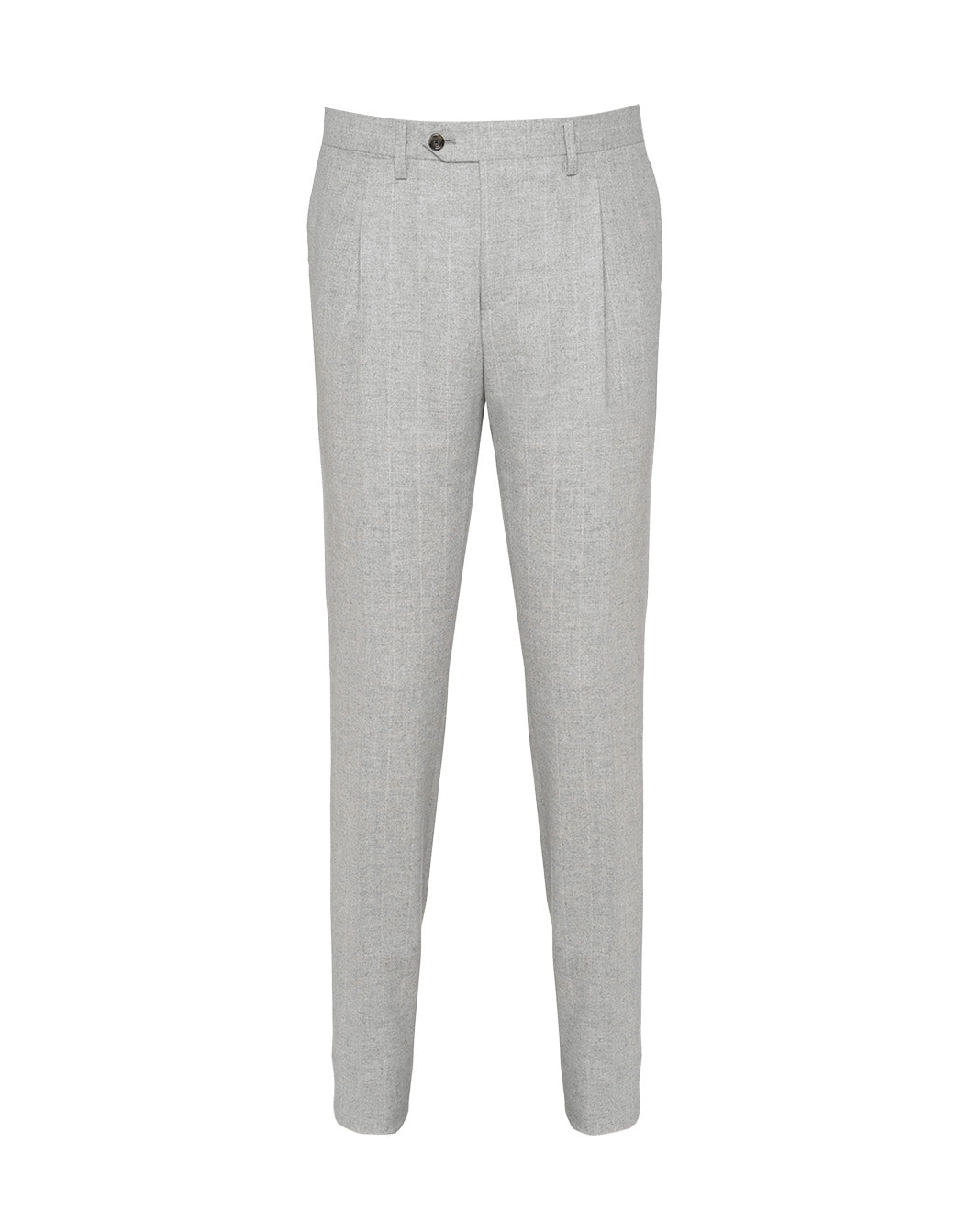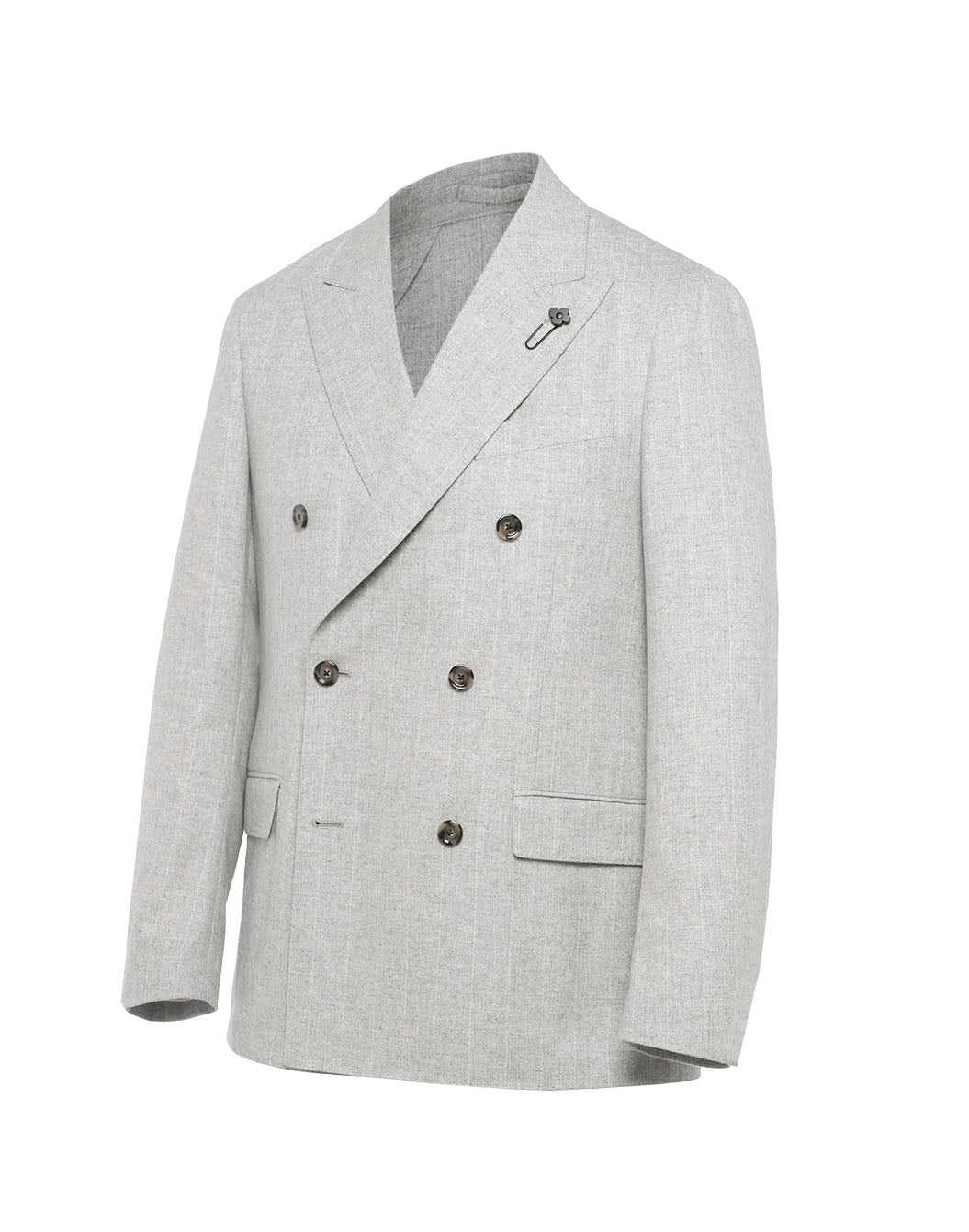 柔らかなライトフランネルにカシミヤをブレンドしたエクスクルーシブ生地が生む、しっとりとしたタッチと上品な微光沢が魅力のダブルブレストスーツ。繊細なペンシルストライプが洗練された印象を添え、ライトグレーの発色がスタイルを明るく引き立てます。1プリーツのトラウザーズは程よいゆとりと美しいラインを両立。素材の柔らかさと構築的なシルエットが融合した、現代的なエレガンスを体現する一着です。