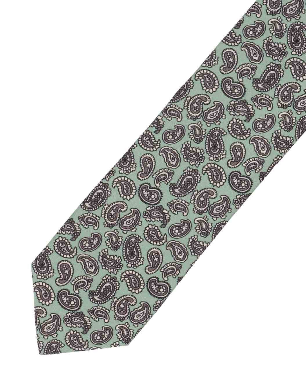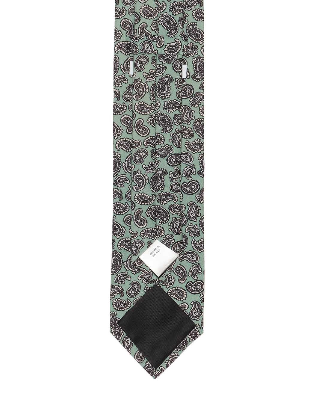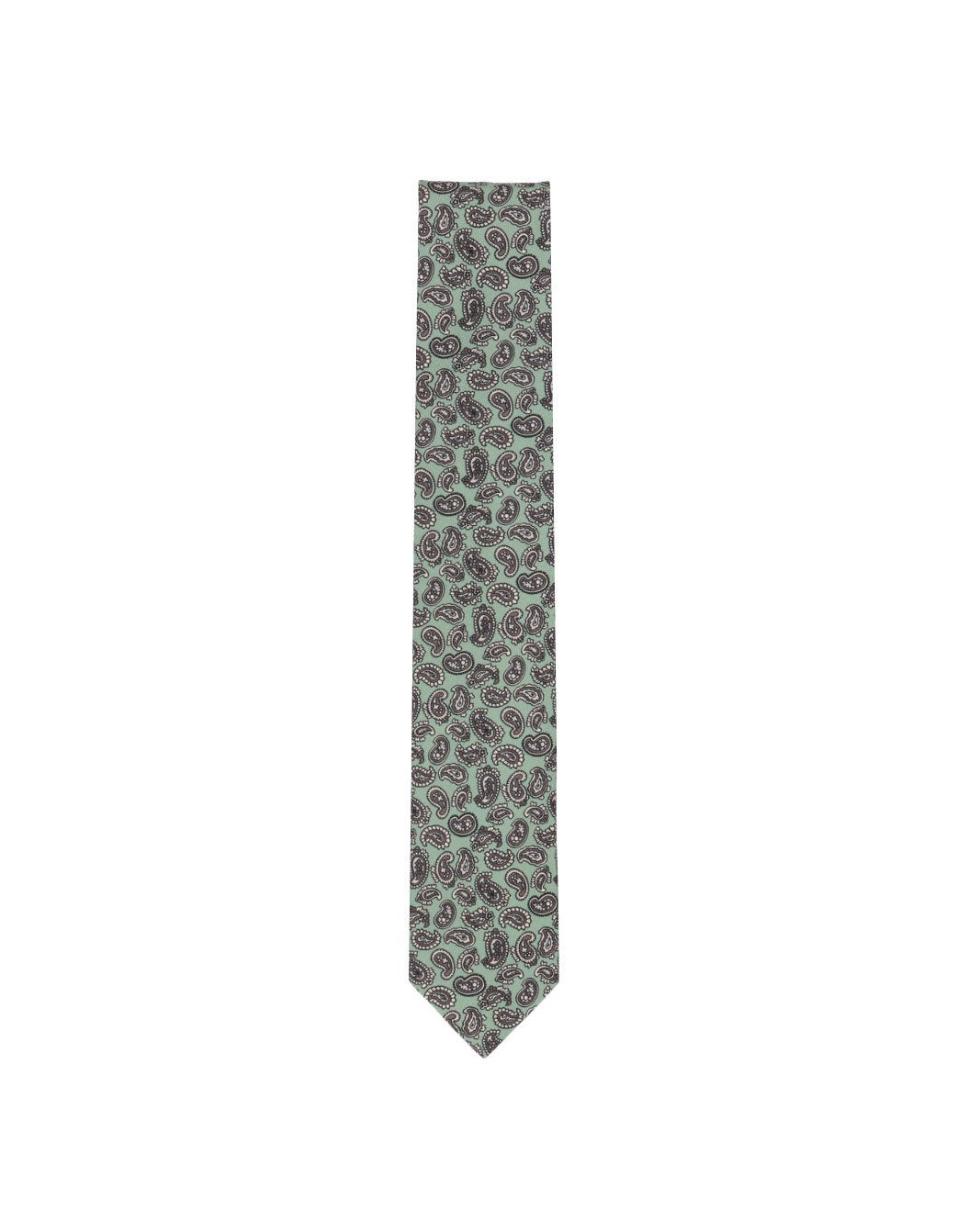 ペイズリープリントが印象的なウールシルクタイ。素材特有の柔らかな風合いと控えめな光沢が上品な表情を生みます。やや絞られたシルエットの大剣は、Vゾーンをスマートに引き締め、クラシックからモダンな装いまで幅広く活躍する一本です。