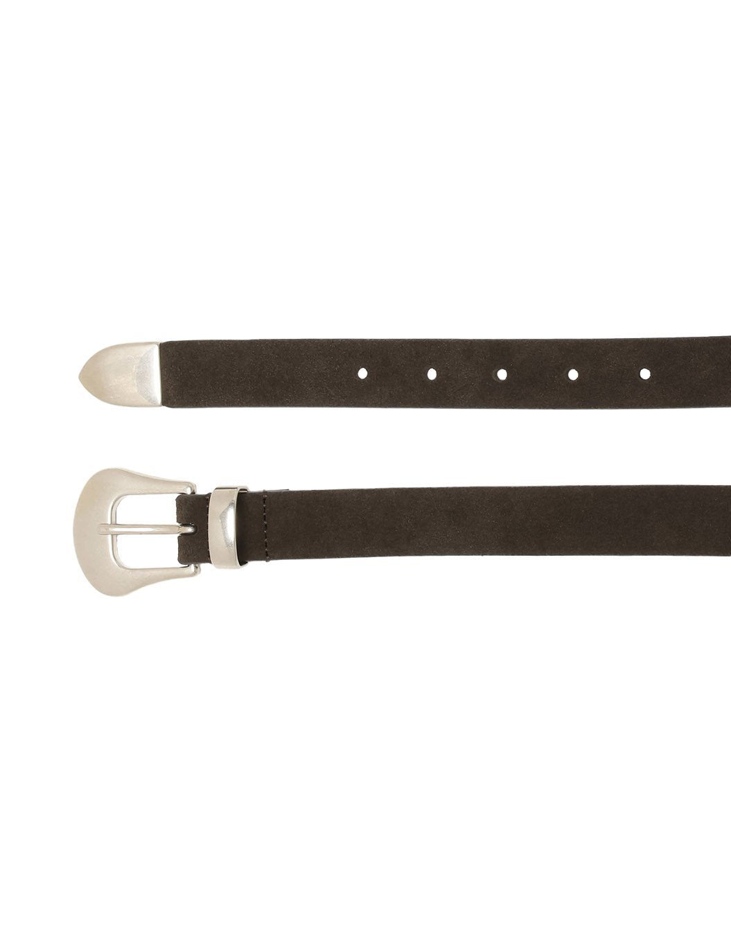 柔らかなカーフスエードを使用した25mm幅のベルト。プンターレ仕様がさりげないアクセントとなり、エレガンスとカジュアルのバランスを巧みに演出します。ジャケットスタイルからデニムまで幅広く合わせられる一本です。
