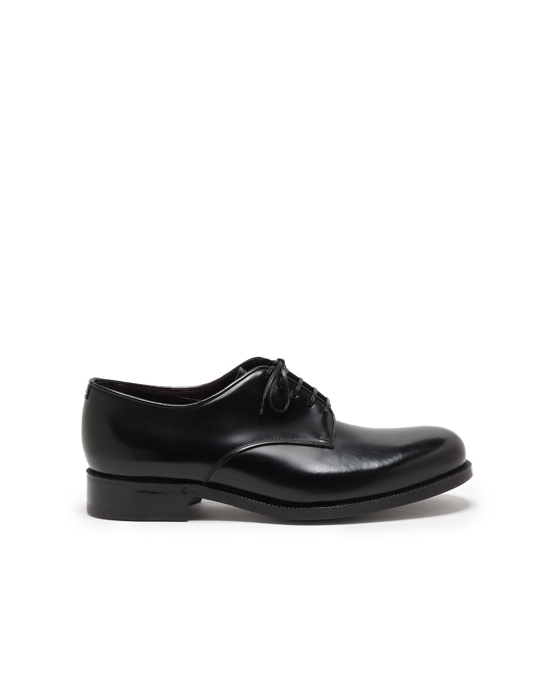 柔らかで光沢のあるブルレザーを用いたプレーントゥシューズ。