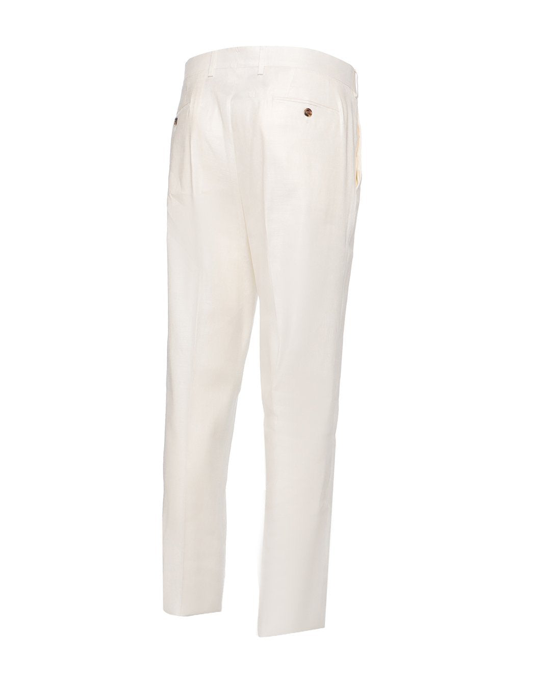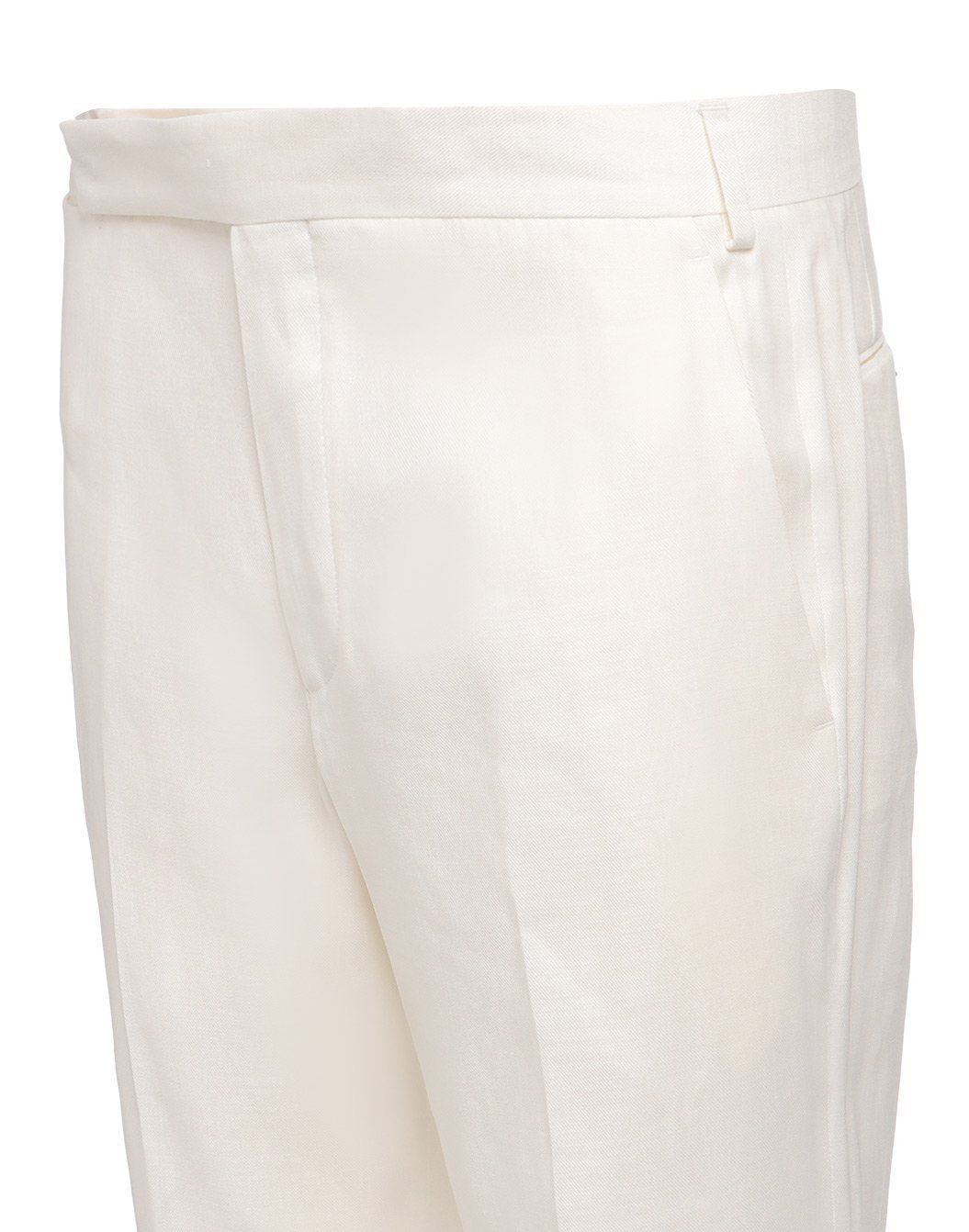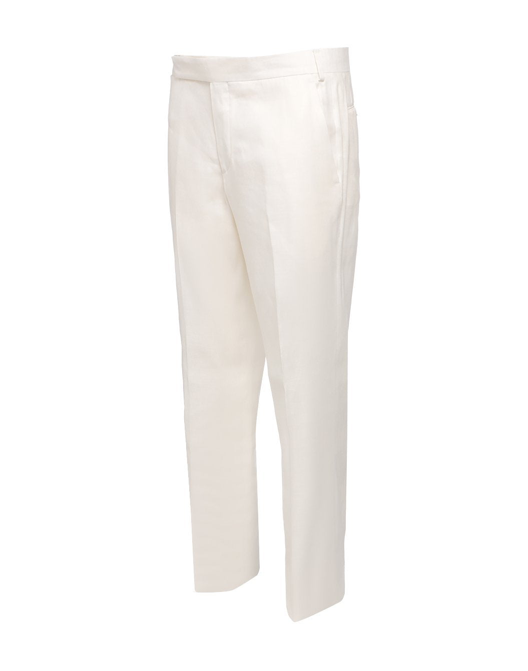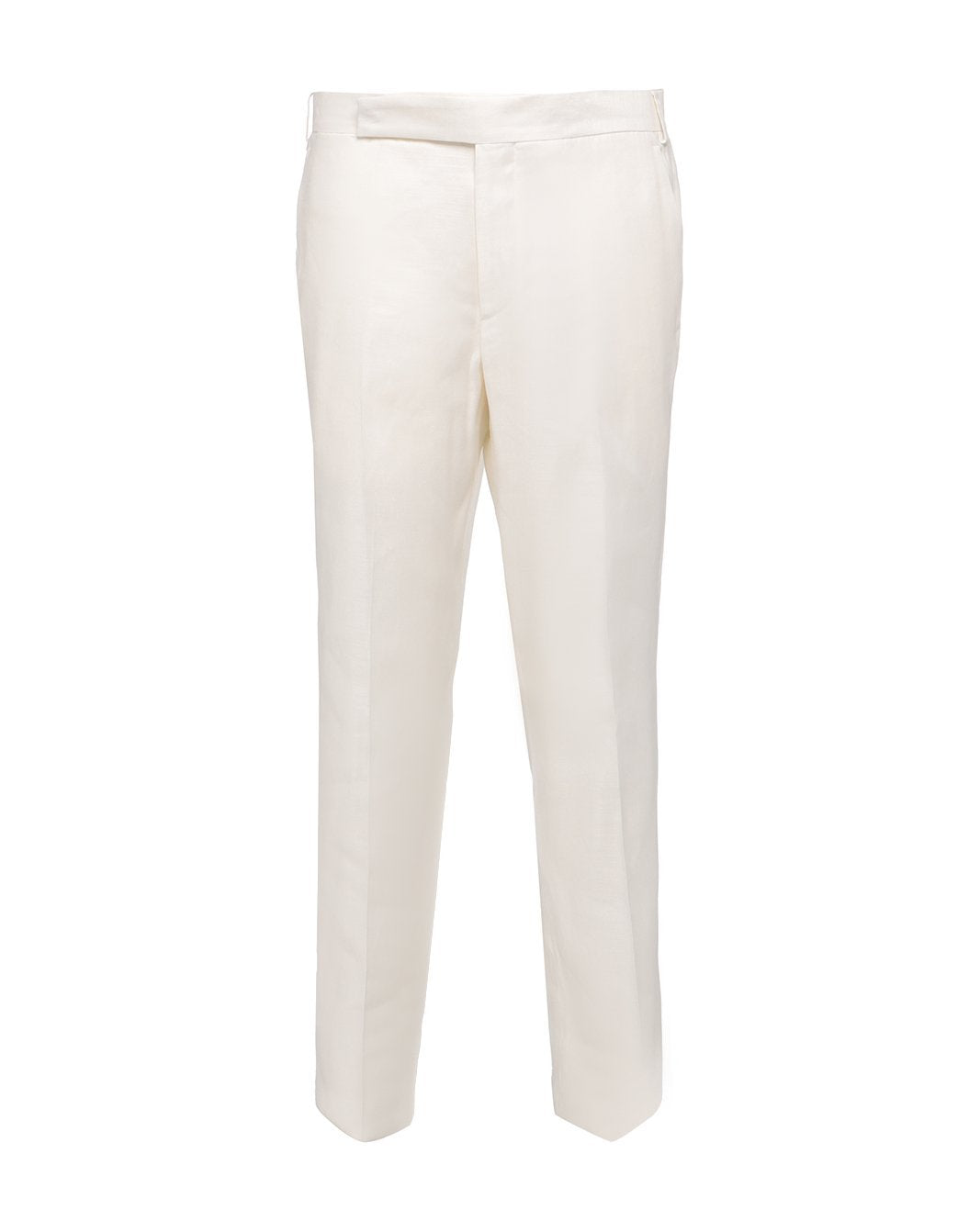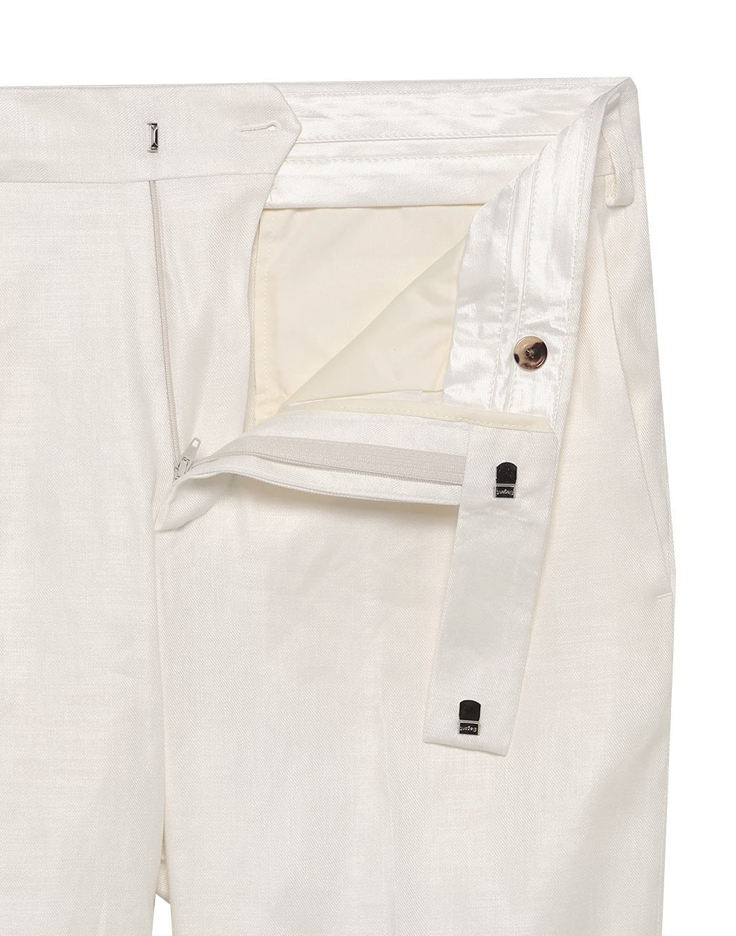 春夏素材の定番であるリネンにレーヨンを混紡し、柔らかさと滑らかさを向上させたトラウザーズ。加えてストレッチが効いており、快適な穿き心地を実現しています。やや広めの裾幅がモダンな印象に仕上がっています。