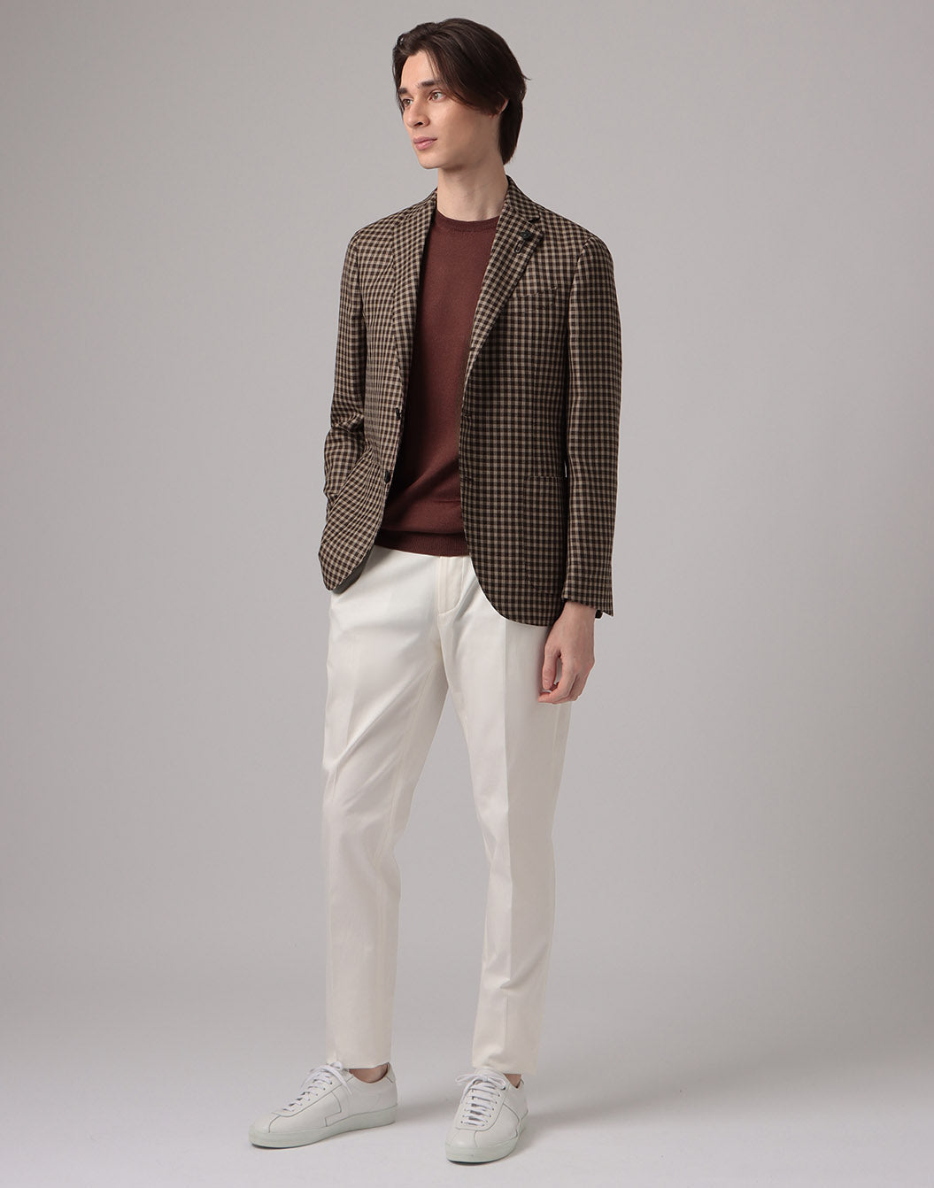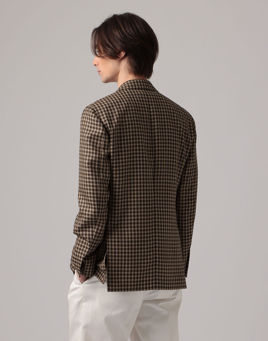 シックな色使いと上品なダミエ柄が目を引くジャケット。シルクを混紡しており滑らかさと控えめな光沢感が加わっています。秋冬のイメージがあるブラウンも、ホワイトパンツなど軽めのアイテムで合わせれば洒落た春夏のコーディネートに仕上がります。