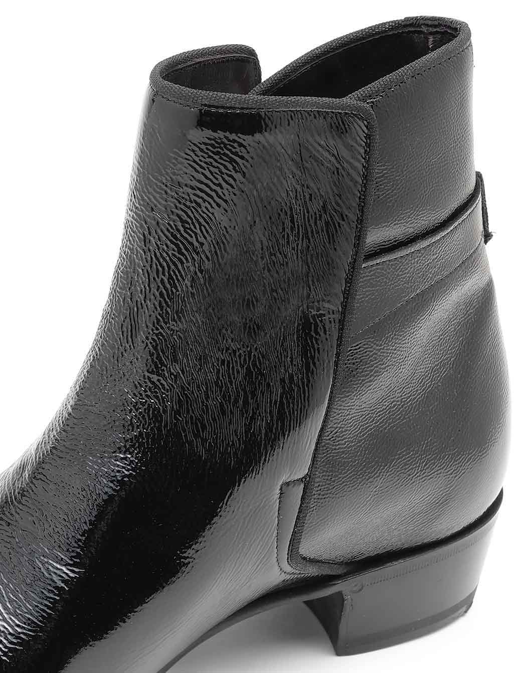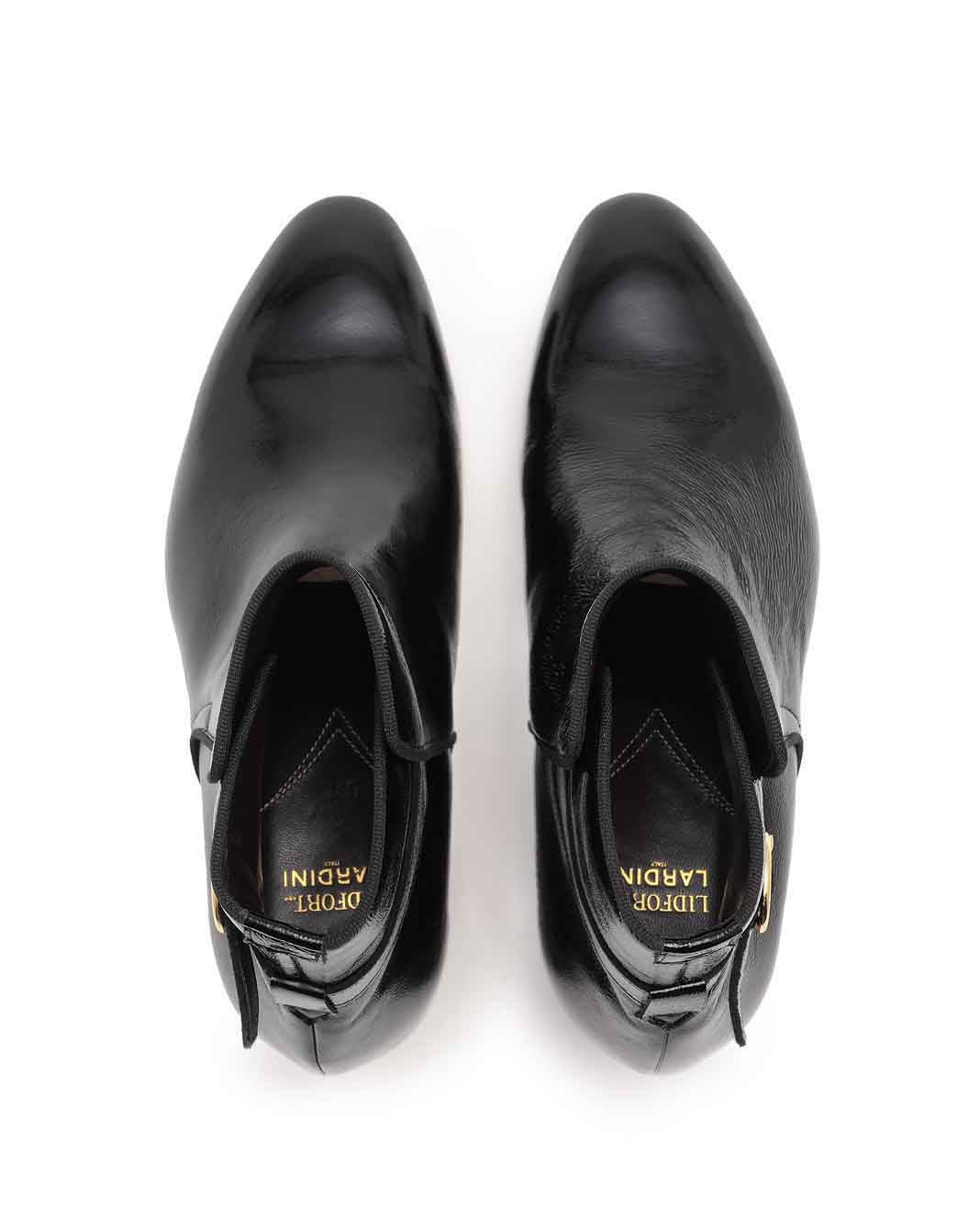 フォーマルな印象のあるエナメルにシワ加工を施すことでこなれた雰囲気に仕上げたアンクル丈のブーツです。ラウンドトゥのシャープなシルエットはラルディーニのスタイルをモードな印象に仕上げてくれます。